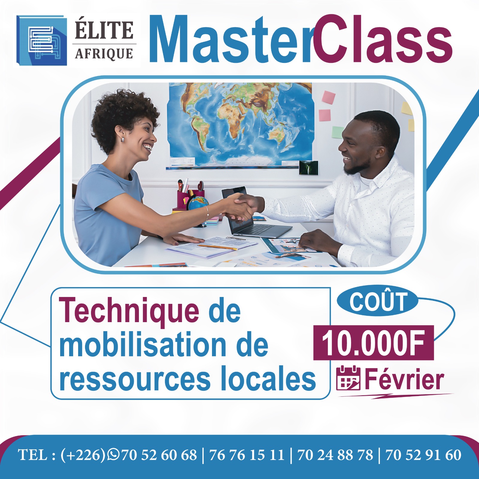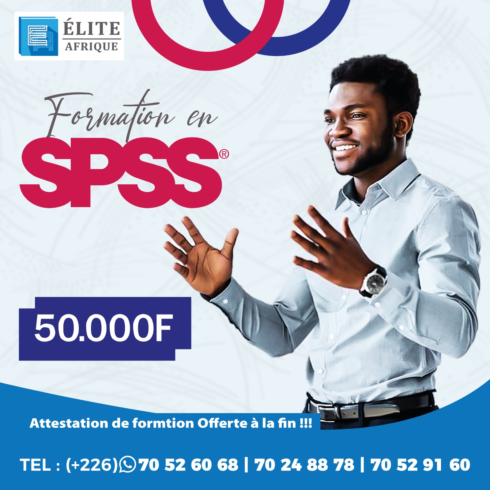 Horaire : De 18h à 21h (Idéal pour les professionnels) Investissement : 50.000 F CFA Le plus : Attestation de formation offerte en fin de session !Le futur n’attend pas. Les places sont limitées !Inscrivez-vous maintenant : (+226) 70 52 60 68 (+226) 70 24 88 78 (+226) 70 52 91 60