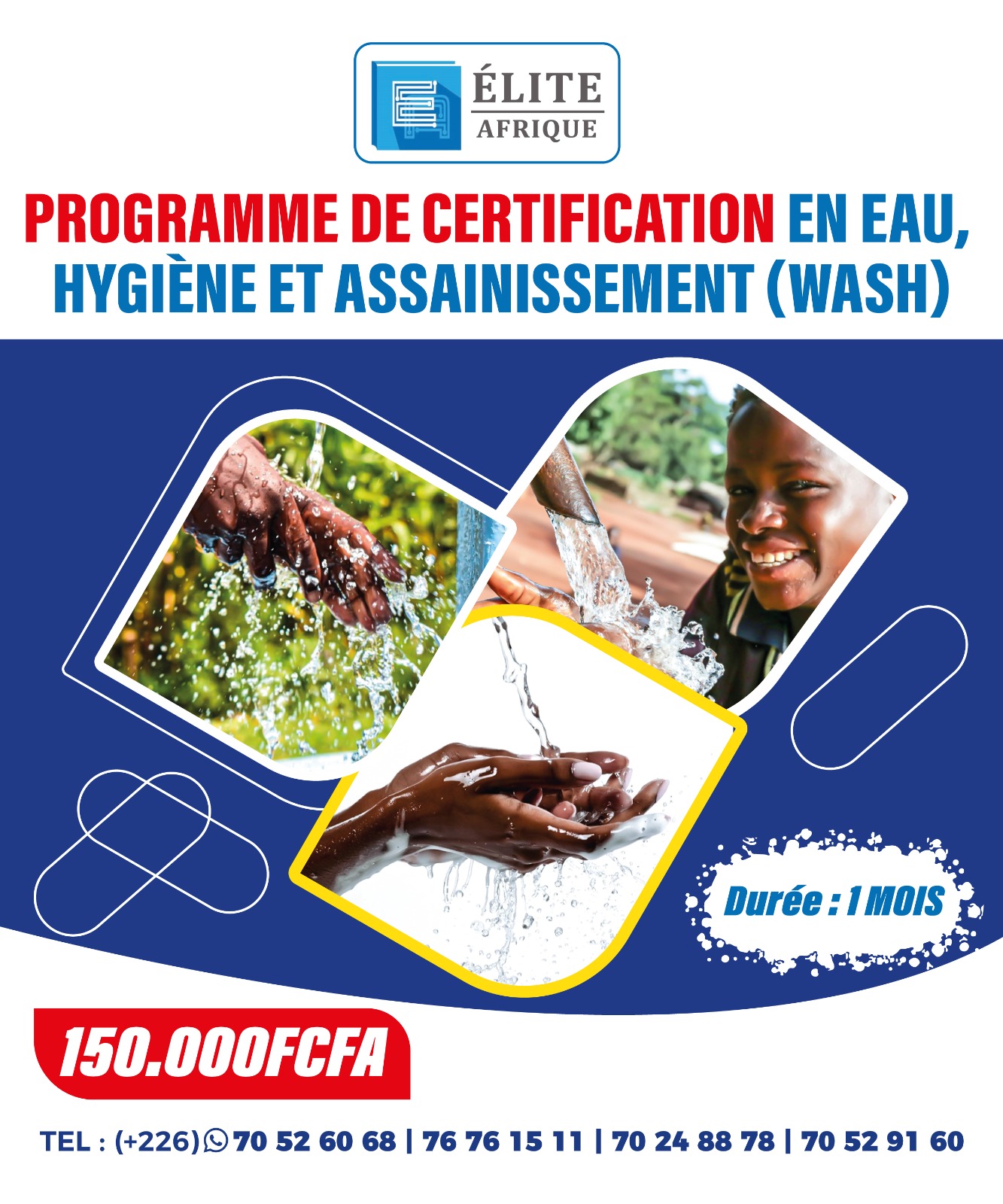 Dans un contexte où l’accès à l’eau potable, à l’hygiène et à l’assainissement constitue un enjeu majeur de santé publique en Afrique, ÉLITE AFRIQUE lance son 𝐏𝐫𝐨𝐠𝐫𝐚𝐦𝐦𝐞 𝐝𝐞 𝐂𝐞𝐫𝐭𝐢𝐟𝐢𝐜𝐚𝐭𝐢𝐨𝐧 𝐞𝐧 𝐄𝐚𝐮, 𝐇𝐲𝐠𝐢𝐞̀𝐧𝐞 𝐞𝐭 𝐀𝐬𝐬𝐚𝐢𝐧𝐢𝐬𝐬𝐞𝐦𝐞𝐧𝐭 (𝐖𝐀𝐒𝐇), conçu pour former des professionnels compétents, crédibles et opérationnels.